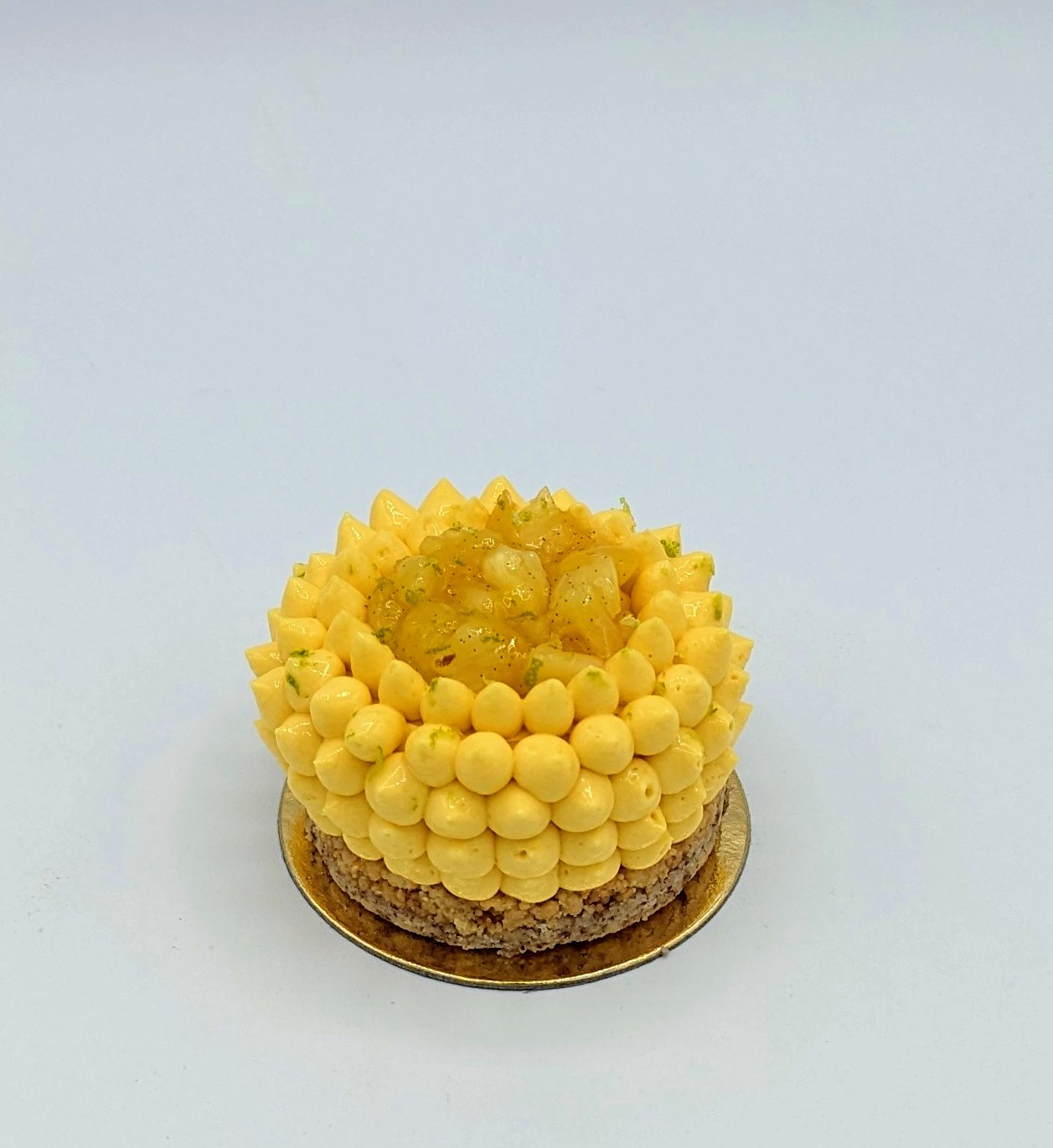 Compotée de mangue/ananas, dacquoise noisette, mousse mangue/passion, crumble croustillant et zestes de citron vert